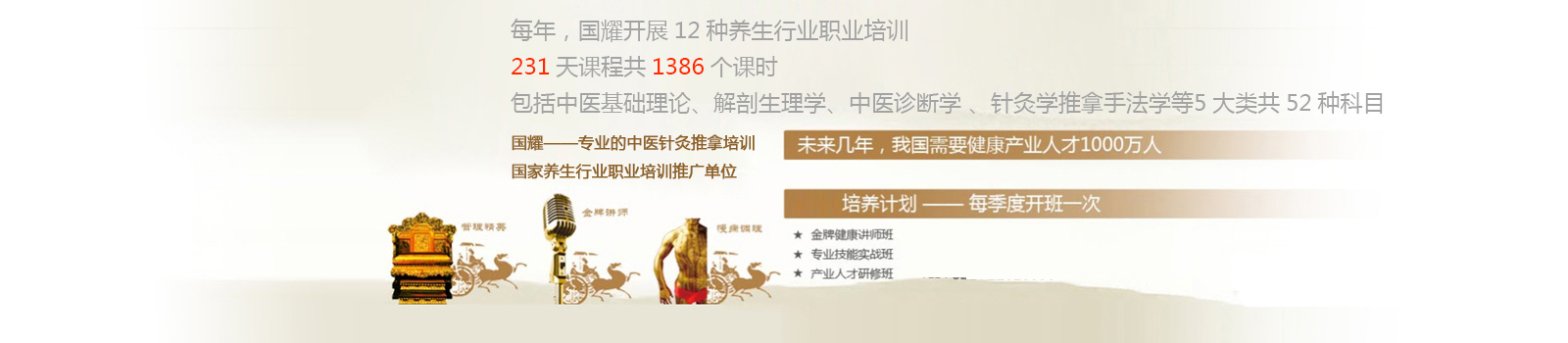 培训共180个学时,每月月初开班。有脱产班和周末班两种培训形式。(国耀中医培训的学员可以免费复训3年)