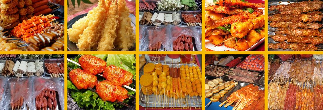 水产品:炸青虾串●炸鹌鵲蛋●炸豆腐串●炸千张串●炸臭干子●炸龙虾串●炸素鸡串●炸鱼干●串鱼泡●炸蟹棒●炸海带●炸鱿鱼串●炸墨鱼串